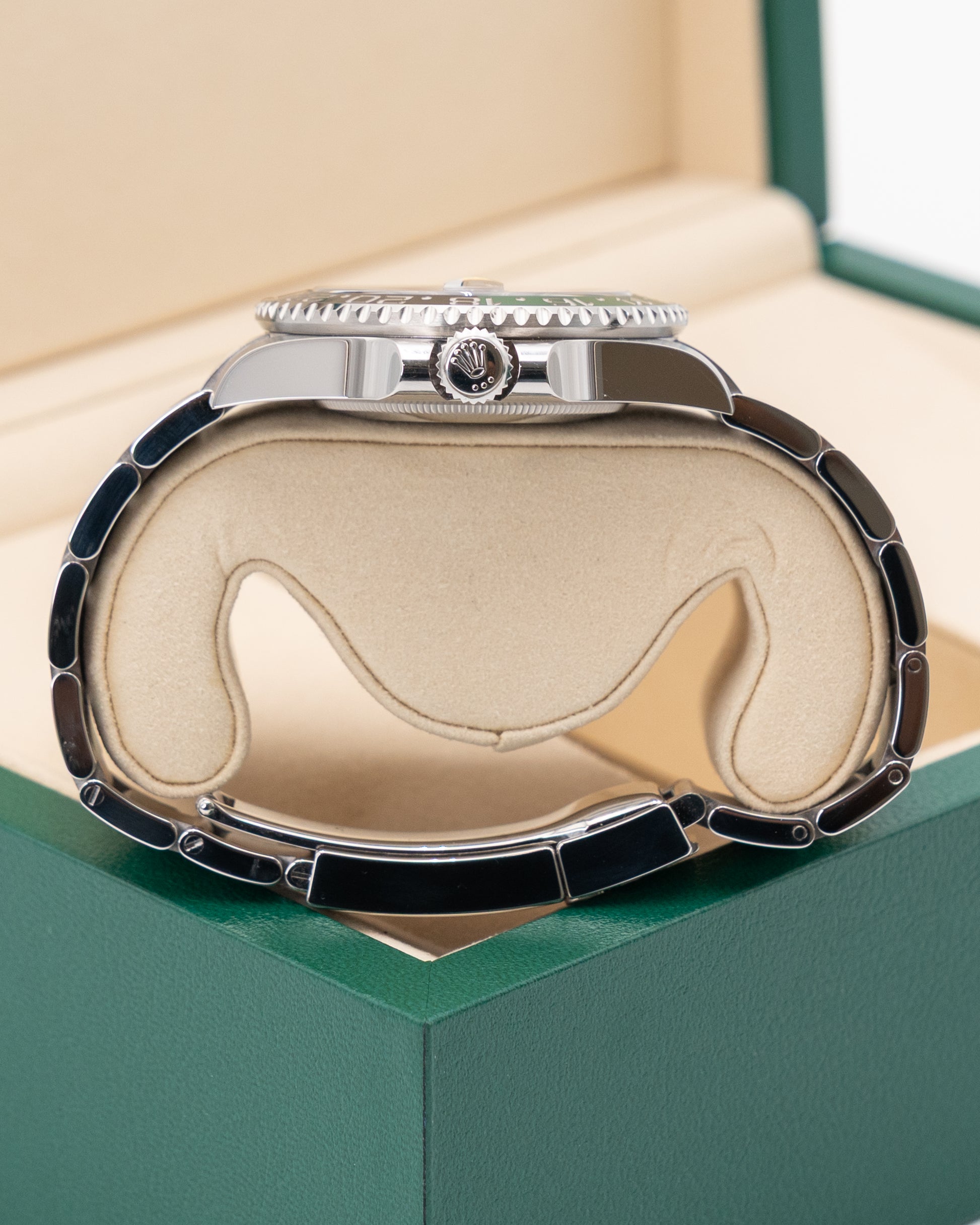 The Rolex GMT-Master II 126720VTNR-0001, nicknamed the “Sprite”, is a bold and contemporary take on Rolex’s legendary traveler’s watch. Its 40mm Oystersteel case pairs perfectly with the black dial and the striking green and black Cerachrom bezel insert, a colorway unique to this model. Unlike traditional GMT configurations, the “Sprite” features its crown and date window on the left side, making it a standout among Rolex’s lineup. The robust Oyster bracelet ensures comfort and durability, while the signature design codes of the GMT-Master II remain unmistakable.