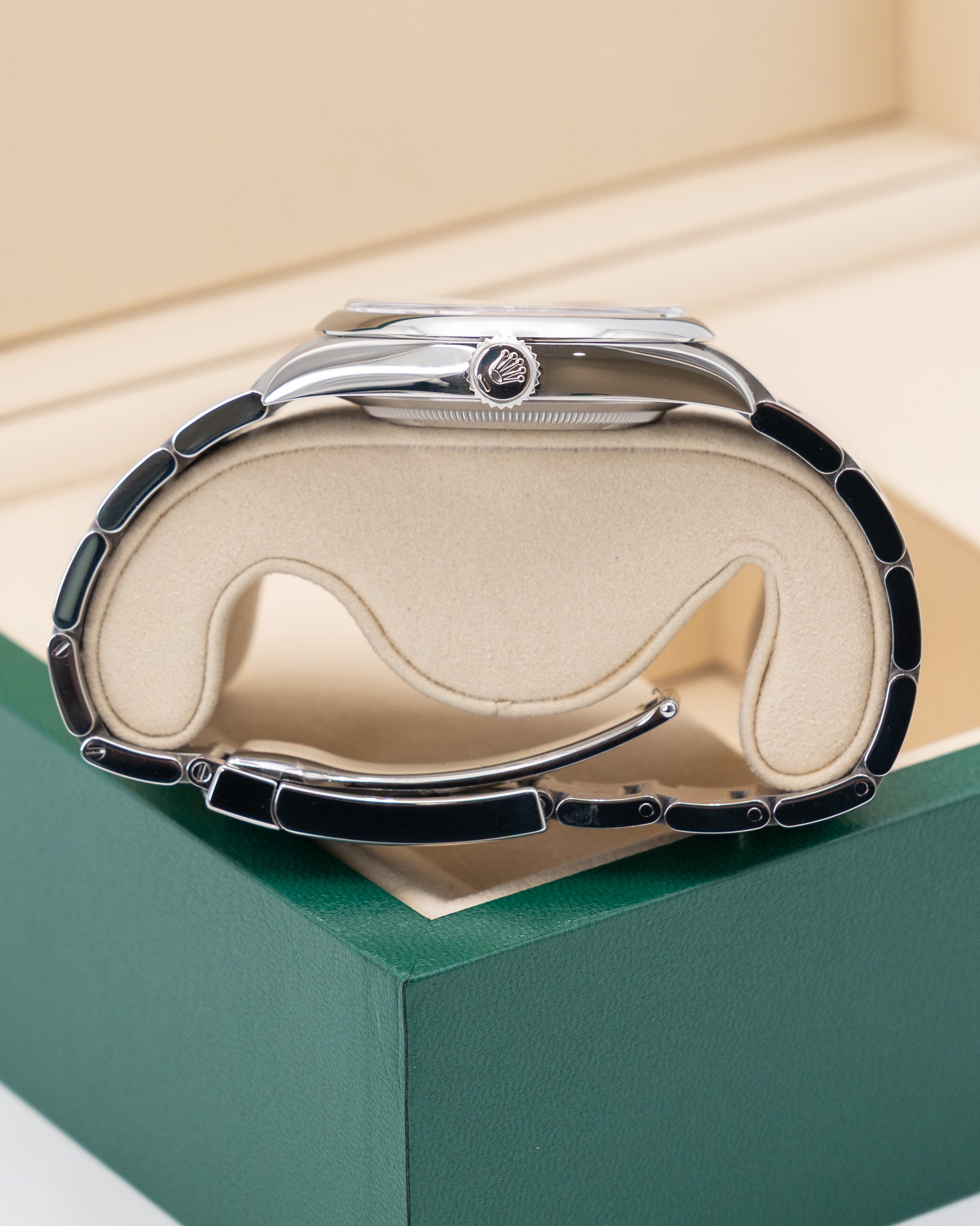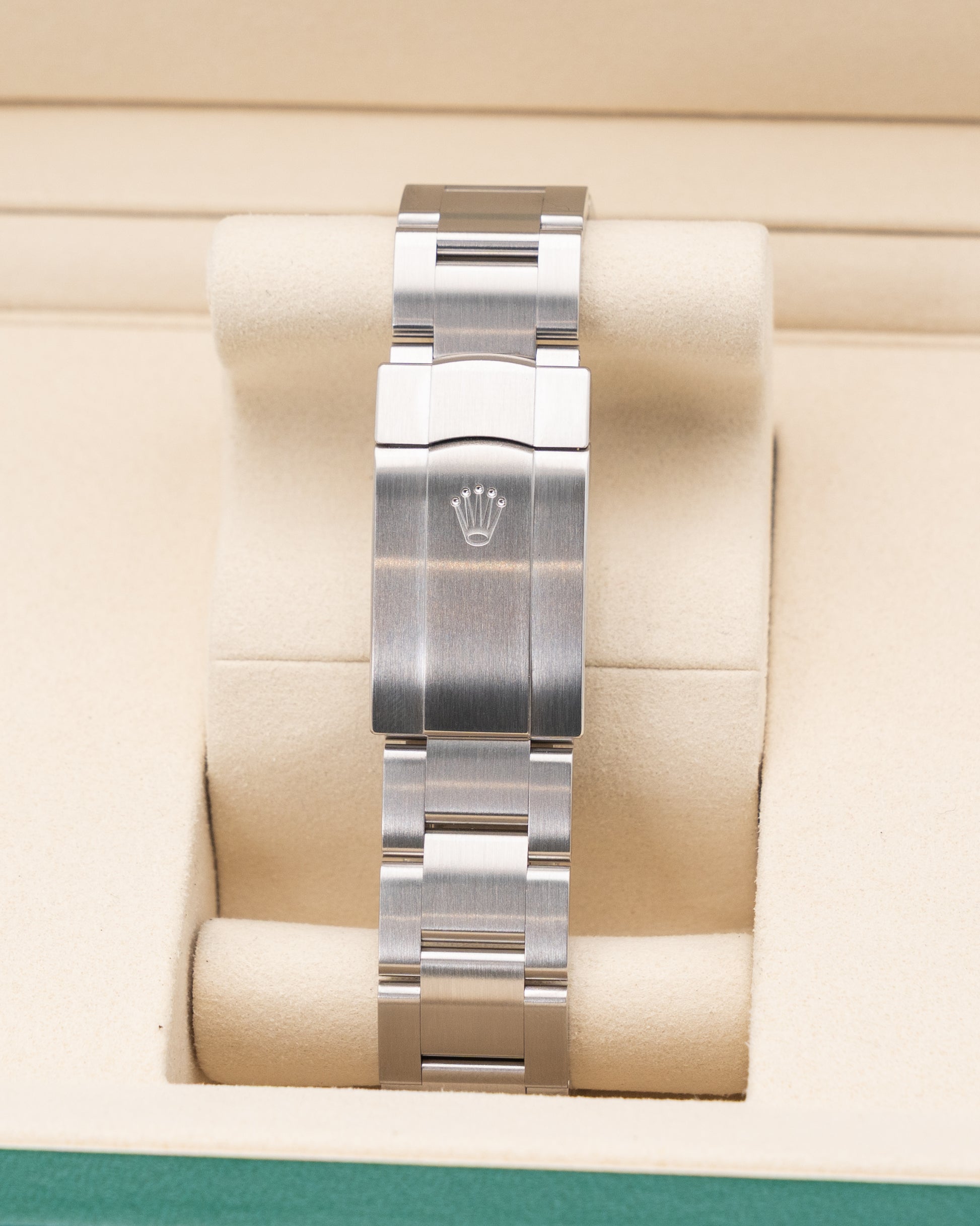 The Rolex Oyster Perpetual 41 134300-0004 is a bold and contemporary expression of Rolex’s timeless design, crafted entirely in Oystersteel for durability and a refined aesthetic. Its 41 mm case is perfectly proportioned, making it a versatile size for modern tastes while maintaining the elegance of the Oyster Perpetual lineage. The standout feature is its striking green dial, a vibrant color that brings fresh energy to the collection while remaining clean and minimalist. Paired with the robust Oyster bracelet, the watch seamlessly combines sportiness with everyday sophistication.