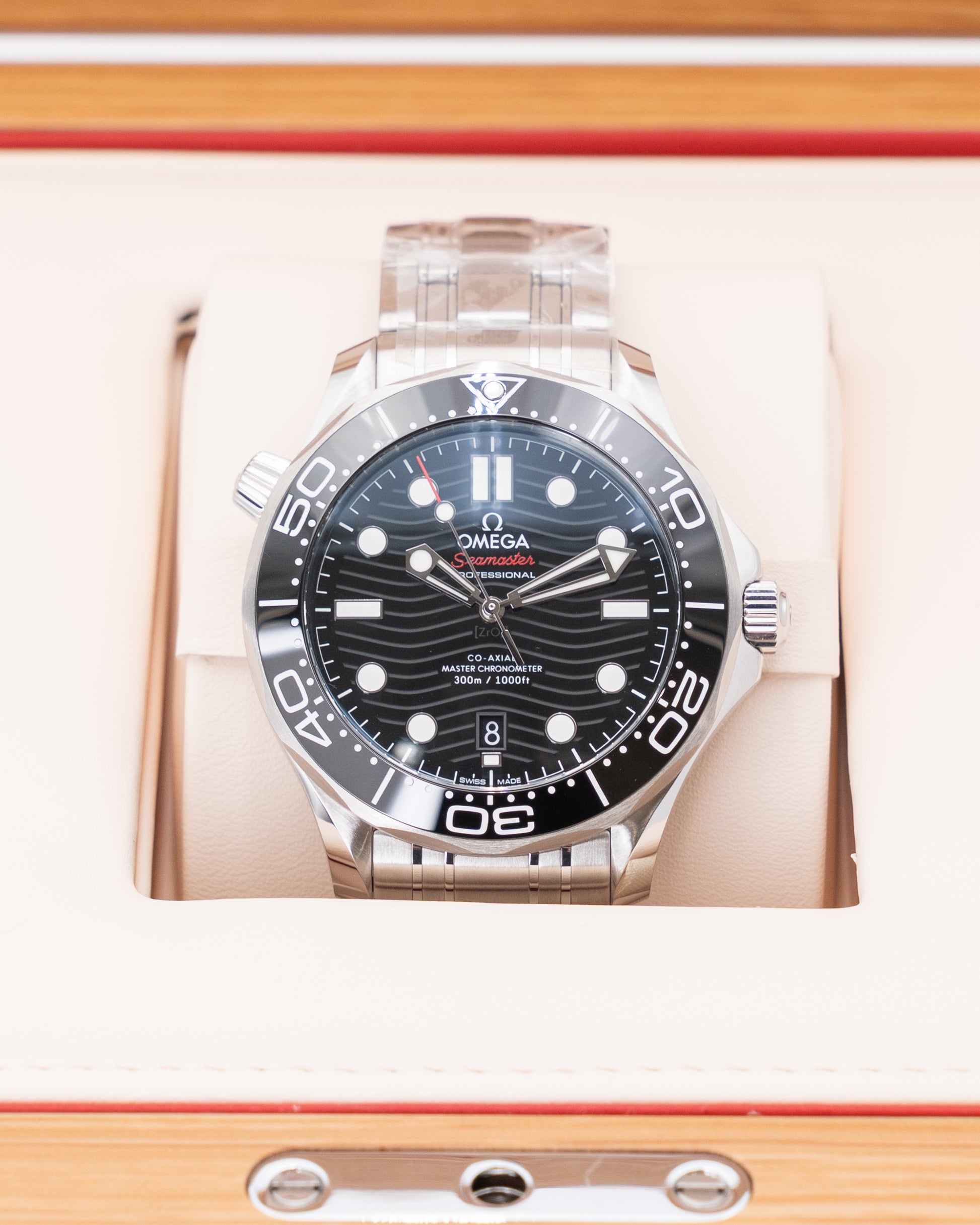 The Omega Seamaster Diver 300M Master Co-Axial reference 210.30.42.20.01.001 is a modern classic that seamlessly combines heritage design with cutting-edge innovation. Its 42 mm stainless steel case is paired with a sleek black ceramic dial, enhanced by the signature laser-engraved wave pattern that reflects Omega’s deep-sea legacy. The polished ceramic bezel with a white enamel diving scale adds contrast and functionality, while the skeletonized hands and raised indexes, filled with Super-LumiNova, ensure perfect visibility even in the darkest depths.
