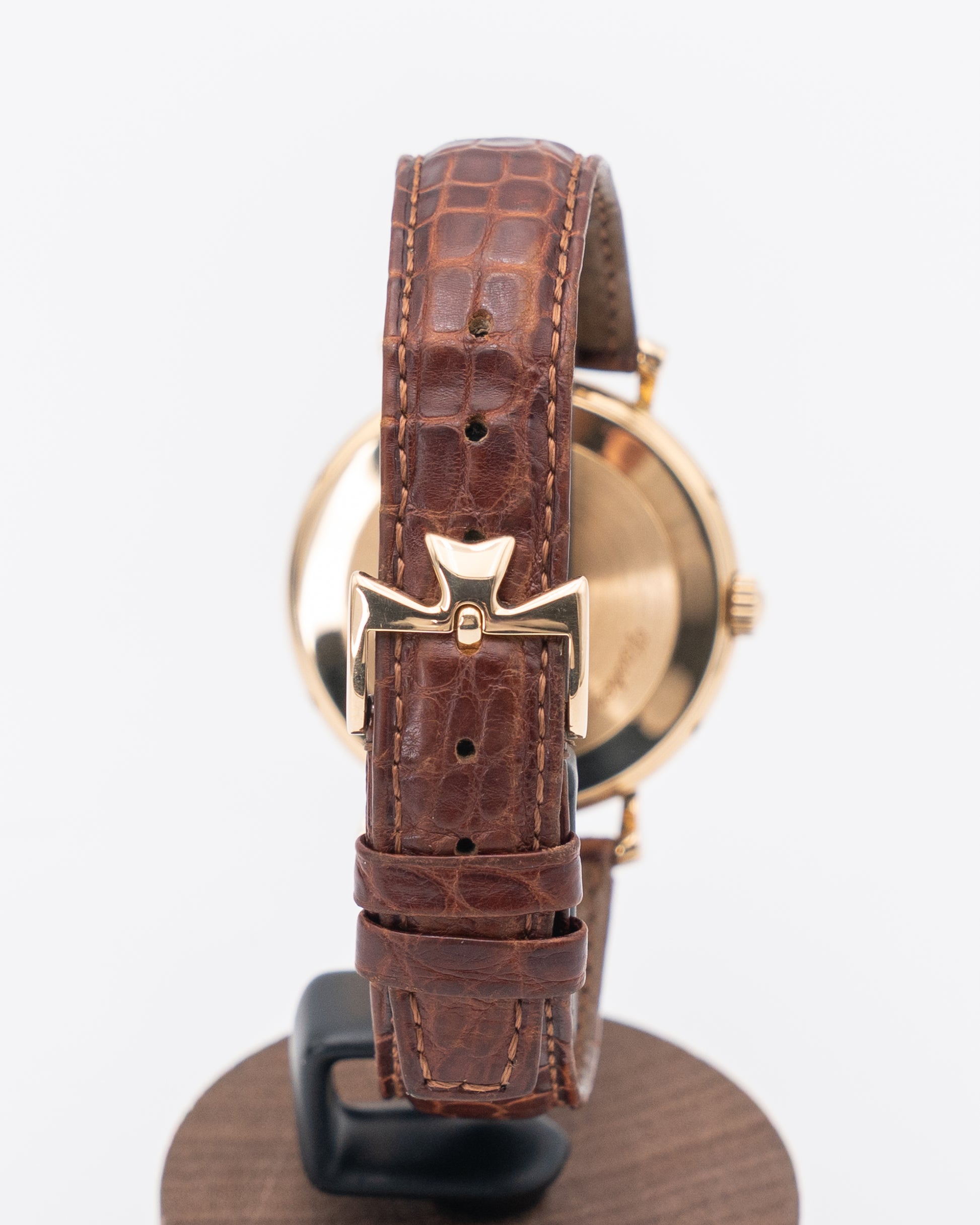 The Vacheron Constantin Historiques Triple Calendar Moonphase (Ref. 47050) is a beautifully refined expression of classical watchmaking, embodying the brand’s dedication to timeless elegance and technical mastery. Crafted from luxurious yellow gold, its 36 mm case exudes understated sophistication, perfectly balanced by a soft cream dial that radiates warmth and vintage charm. The triple calendar and moonphase complications are gracefully arranged, offering a harmonious display of date, day, month, and lunar cycle. Paired with a supple leather strap, this piece captures the essence of traditional haute horlogerie with impeccable proportions and refined aesthetics.
