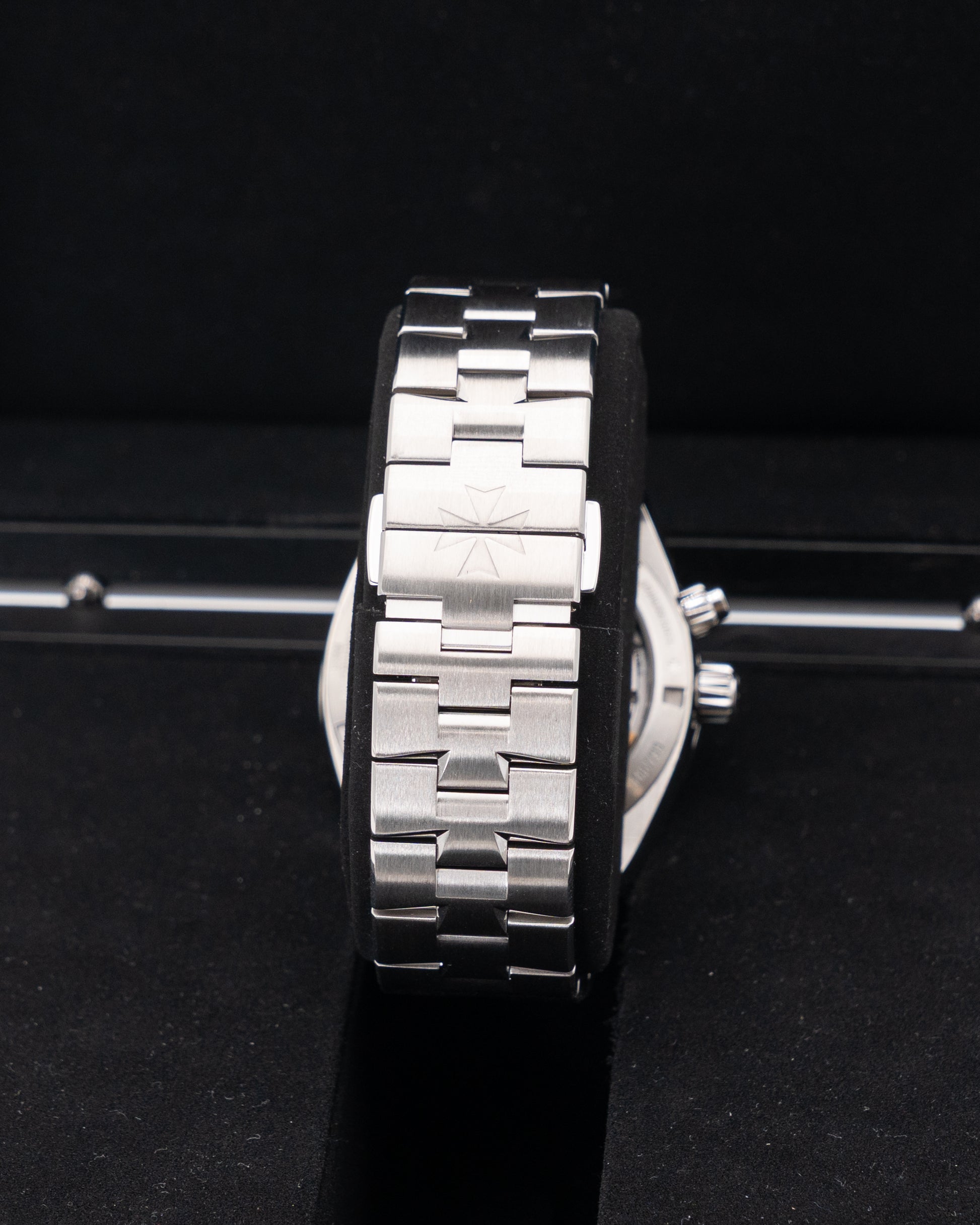 The Vacheron Constantin Overseas Dual Time (Ref. 7900V/110A-B546) embodies refined versatility and world-class craftsmanship, designed for those who live and travel with purpose. Its 41 mm stainless steel case is meticulously finished, featuring the signature notched bezel inspired by the Maltese cross—an emblem of the brand’s heritage. The black dial offers exceptional legibility with luminous markers, a date display, and a dual-time complication that elegantly tracks home and local time zones. Paired with a polished stainless steel bracelet, this timepiece perfectly balances sportiness and sophistication.