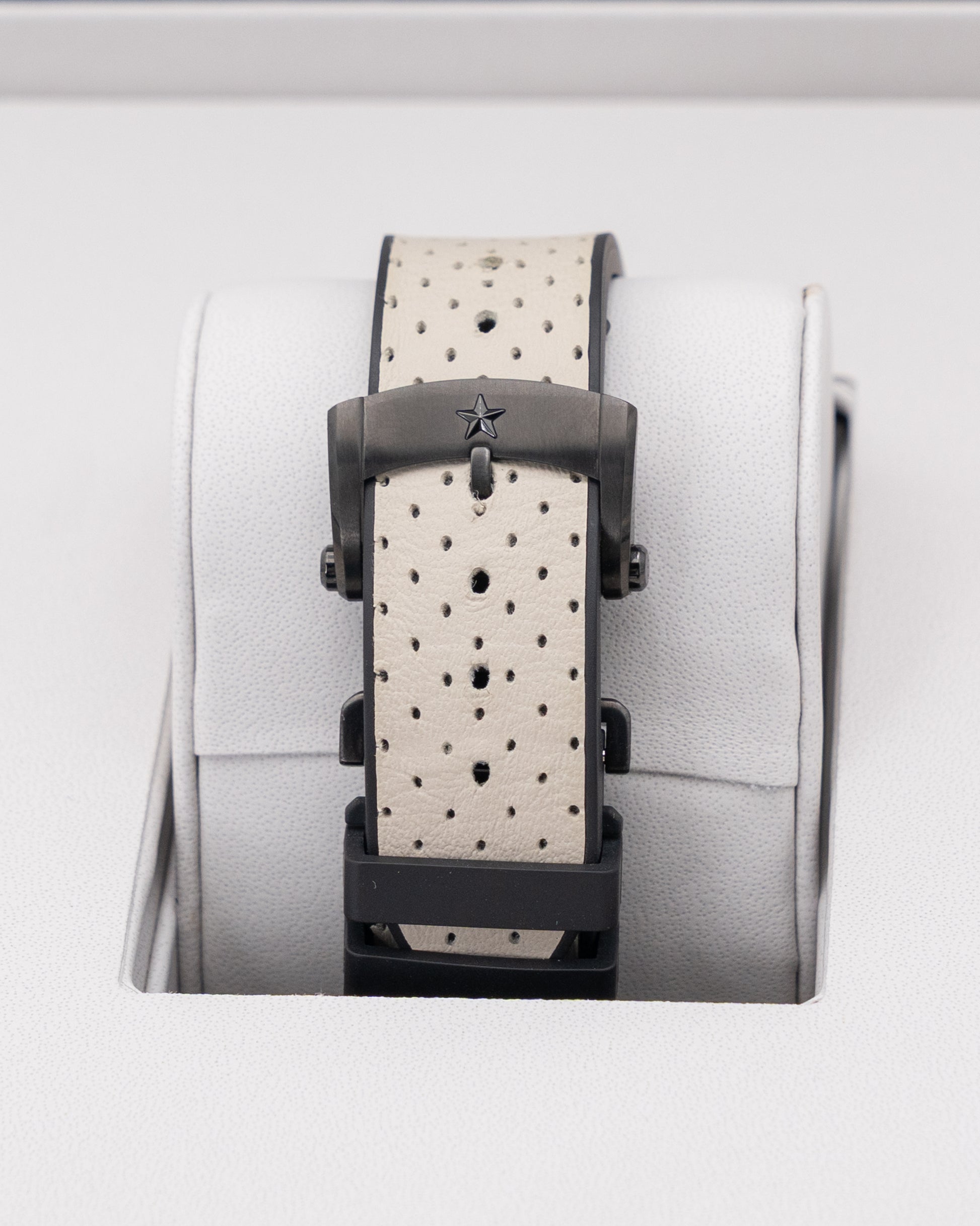 The Zenith El Primero Chronomaster Range Rover Edition (Ref. 24.2040.400) is a sophisticated tribute to two icons of precision engineering—Zenith’s legendary chronographs and Range Rover’s enduring automotive excellence. Crafted with a 42 mm matte black ceramic-aluminum case, this timepiece exudes a sleek, modern presence that reflects the refined power of its automotive inspiration. The dial features a clean, understated design with subtle Range Rover branding and contrasting subdials that enhance legi bility while maintaining elegance. Its integrated black rubber strap with perforated calfskin—mirroring the luxury interiors of Range Rover vehicles—completes the look with sporty refinement.