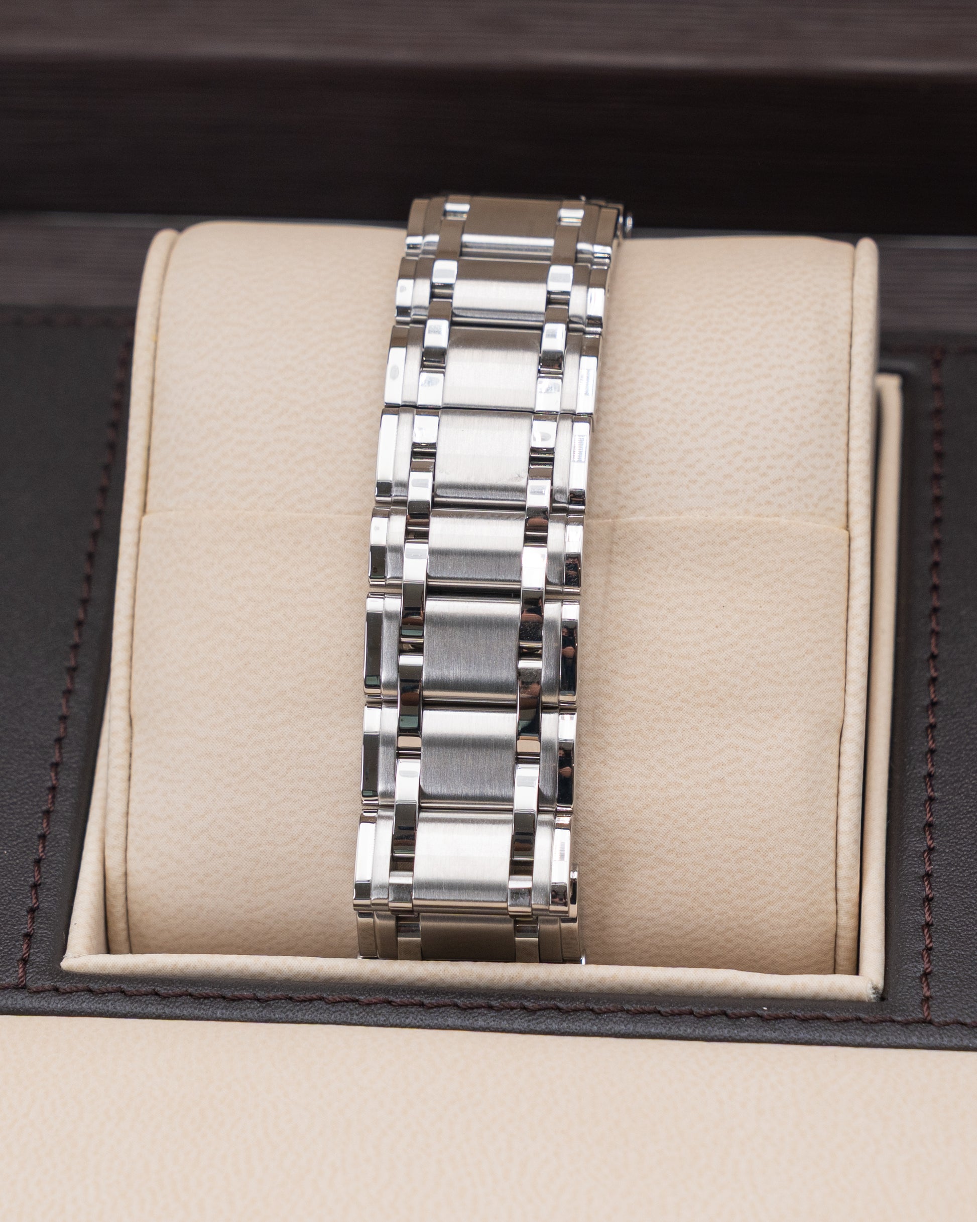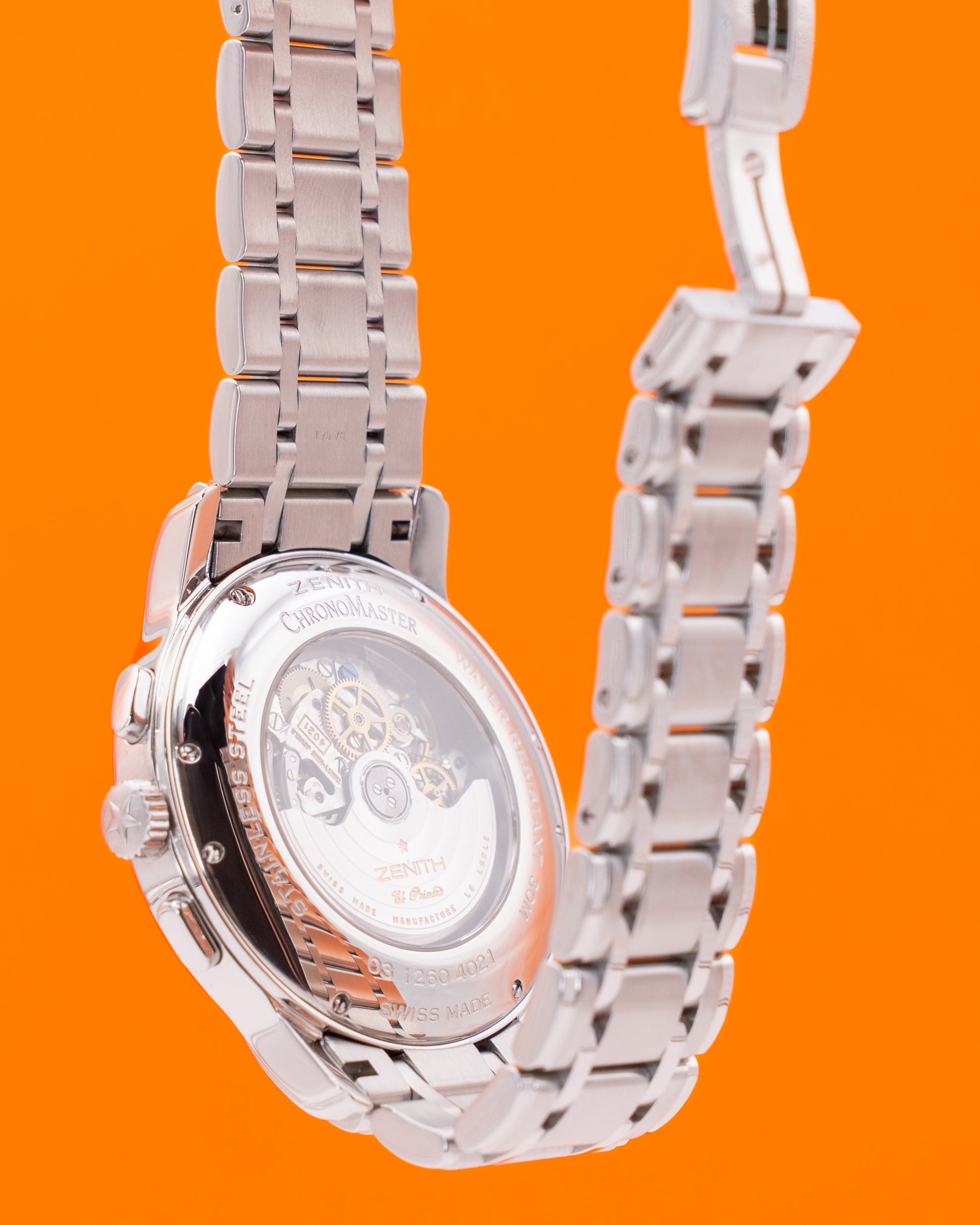 The Zenith Chronomaster Open 03.1260.4021/73.M1260 is a bold and distinctive timepiece that showcases the brand’s mastery of mechanical watchmaking. Housed in a 45 mm stainless steel case, it features Zenith’s signature open-heart design, revealing the intricate balance wheel and escapement through a cutout in the dial. This partial skeletonization allows the wearer to admire the movement in action while preserving the legibility and symmetry of a classic chronograph. The case’s polished and brushed surfaces enhance its refined yet sporty presence, and the stainless steel bracelet adds both durability and an integrated, seamless look on the wrist.